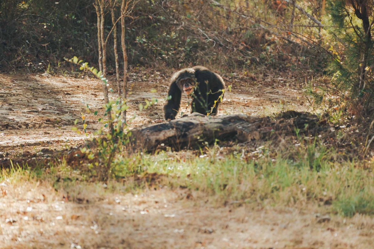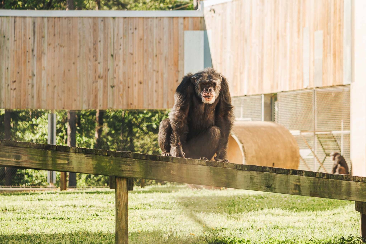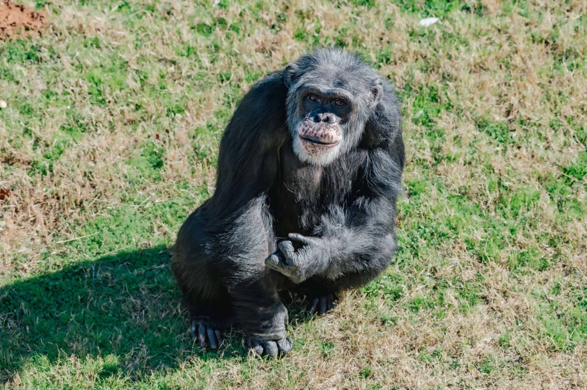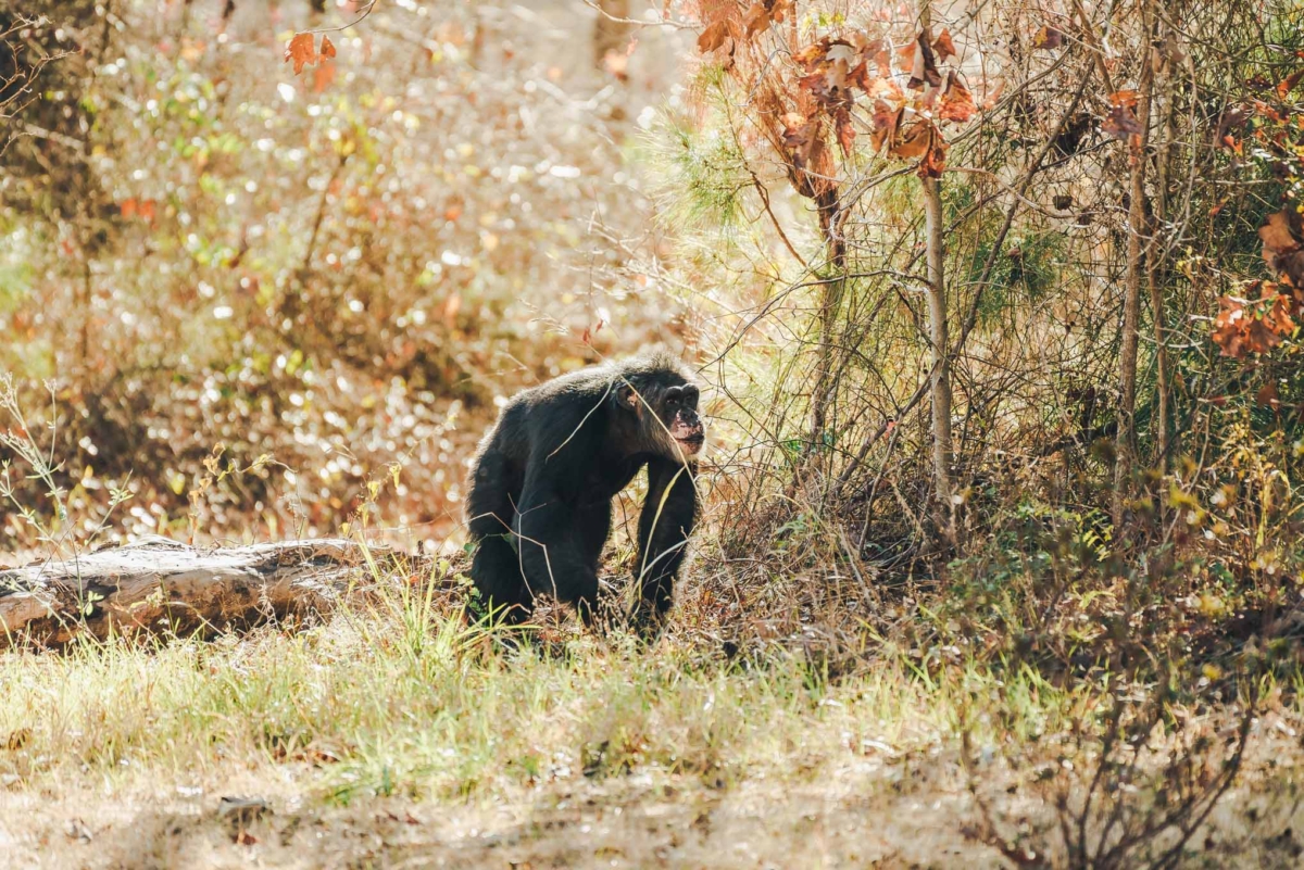 Pocket-sized gentleman Devon might be one of the smallest male chimps at the sanctuary, but you wouldn’t know it by the way he carries himself. Over the past couple of years Devon has come out of his shell and moved up the social ranks, serving as beta to his group’s leader, Bryan. He loves greeting his caregivers when they arrive at the sanctuary, and as they approach his living space, they can hear his distinctive shuffling walk and breathy laugh from down the hall, anticipating a play session. Groupmate Pamela is head over heels for Devon, but it seems to be a one-side infatuation. While Devon certainly doesn’t mind having a groupmate who showers him with attention and thinks he’s better than a bushel of bananas, sadly, he pays her little mind otherwise.