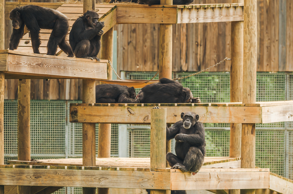When they’re done causing mischief indoors, it’s time to move outside. Large-scale outdoor structures are a central part of the chimps’ outdoor play areas – they’re frequent social hotspots, and a great place for the chimps to lounge in the sun or get some exercise climbing and exploring the multiple levels of the structure…they’re also high on the list of the most frequently repaired items at the sanctuary.