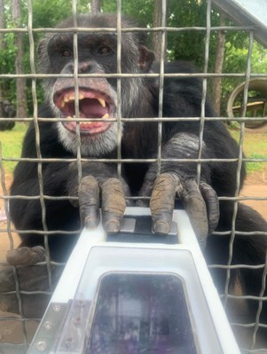 Animal care facilities across the globe are using a variety of strategies to collect cardiac data. In late 2024, several co-workers and I attended a workshop to learn more about these methods and how we can share our data with other facilities. Since there is still a lot about chimpanzee heart health that is unknown, we value these opportunities to collaborate with other professionals. Some of the procedures discussed at the workshop included awake blood draws, blood pressure readings, EKGs, and echocardiograms. While we are still figuring out how to implement some of these methods at Chimp Haven, many of our residents have become pros at Kardia Mobile, a method for awake EKG readings. Nine of our chimps have completely mastered this behavior while 64 others are still practicing with their trainers. Others are working on presenting their body parts, which is the first step towards interacting with the Kardia Mobile equipment. We are so proud of all of them and will continue to work with all of them at whatever pace works for their chimp schedules. Although we offer delicious snacks for participation, we can’t blame them for occasionally spending time with friends over training with us.