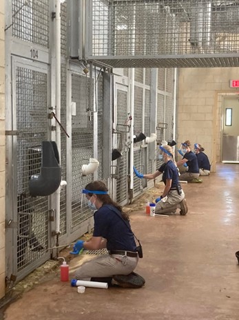 Currently, the team is working to implement several solutions for monitoring heart health in the chimps. Like in humans, cardiac issues are common in chimpanzees, and Chimp Haven is committed to providing our residents with exceptional medical care. This includes monitoring their health through our Positive Reinforcement Training (PRT) program. PRT gives our team a lot of opportunities to practice creative problem solving. With roughly 300 chimps in our care, we’re lucky that our team is well versed in the art of chimpanzee creativity.